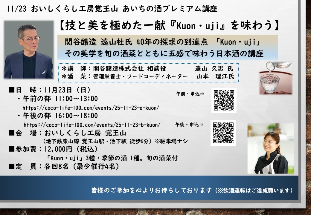 11/23午前 おいしくらし工房覚王山【技と美を極めた一献 Kuon・uji を味わう】あいちの酒プレミアム講座