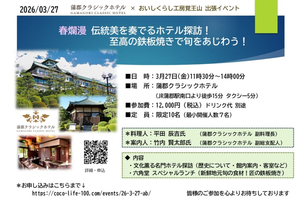 2026年3月27日 @ 11:30~14:00 – 【春爛漫 伝統美を奏でるホテル探訪!至高の鉄板焼きで旬をあじわう!】 2026年3月27日㈮11時30分~「蒲 […]